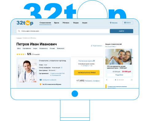 Программа для стоматологических клиник разрабатывается командой крупнейшего портала 32top, который работает с 2008 года. Ваша клиника может получать дополнительный приоритет во всех списках клиник на сайте, а заявки от пациентов будут приходить сразу в МИС.