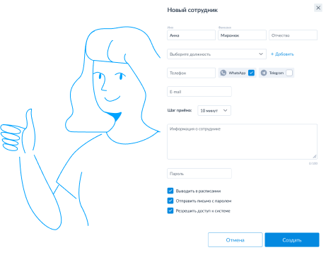 Время на внедрение программы зависит от многих факторов: размеров вашей клиники, целей использования и того, пользовались ли вы CRM ранее. Если вы внедряете ее в первый раз, то на регистрацию и внесение данных в нашей онлайн-системе у вас уйдет от 15 минут до двух часов. Мы можем помочь вам перенести данные из другой программы или Excel абсолютно бесплатно.
